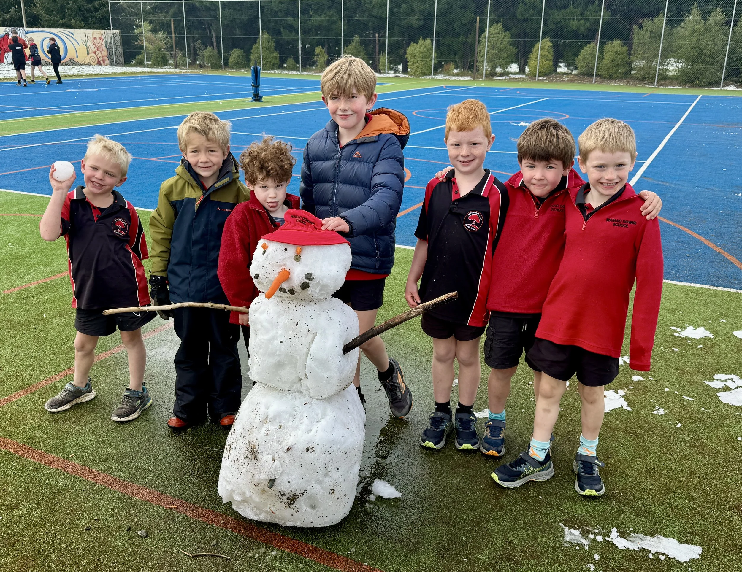 The new administration building was finally opened on the 8 th March 2024. We were thrilled to have Rupert Harrison the oldest ex pupil cut the ribbon as the Mayor or Waimate, Craig Rowley declared the opening of the building. Wendy Heath, our kaumatua blessed the building as she led visitors through the doors to view the space for the first. Kevin Cromie the oldest ex pupil living in the district planted a tree in commemoration of the opening alongside his grandson Tom Studholme, the youngest pupil at school and a 5 th generation family member, to attend Waihao Downs School. Raewyn Francis cut the cake in honour of the new building. Raewyn started teaching in the junior room at Waihao Downs School in 1988 and went on to become the principal from 1995 to 2007. The beautiful cake was created by Lara Welsh who has two children attending Waihao Downs School. Our students supported the principal’s speech with a waiata “Tūtira Mai Nga Iwi” and provided a wonderful performance singing the song “Celebrate” with actions, pom, poms and party poppers to add to the celebration.